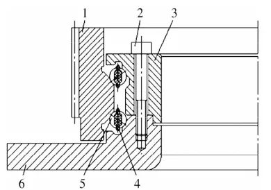 1—外圈壓板螺釘;2—外圈壓板;3—外圈;4—鋼球;5—軸承座;6—內(nèi)圈壓板;7—內(nèi)圈壓板螺釘;8—保持架;9—內(nèi)圈;10—CT機(jī)主軸。