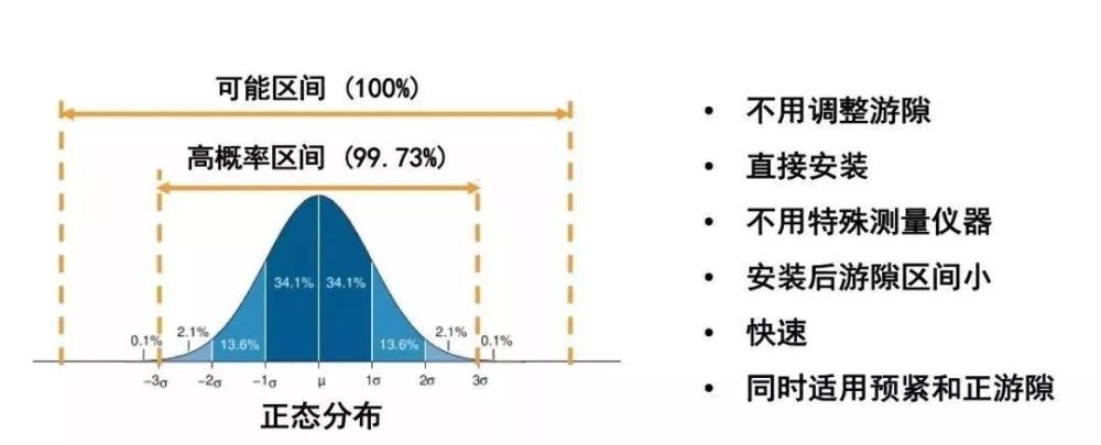 Set-Right使用概率方法并控制相關(guān)零件的尺寸公差來(lái)確保所有的裝配總成中有99.73%的軸承游隙落在可接受的范圍內(nèi)。這是一組隨機(jī)變量組合后的數(shù)學(xué)預(yù)測(cè),變量就是軸承公差和軸、軸承座等安裝組件的公差。